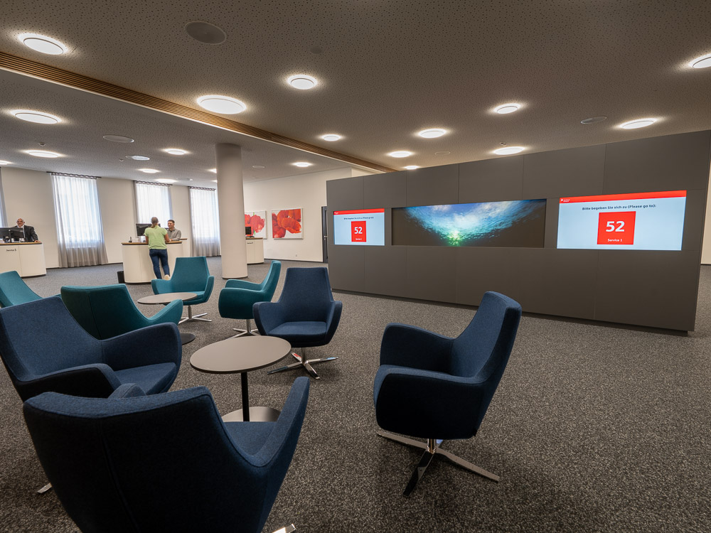 Der Empfangsbereich sollte moderner und einladender gestaltet werden und mit repräsentativer Medientechnik ausgestattet werden. Bei Bedarf sollte er ebenfalls als Veranstaltungsfläche genutzt werden können. Dabei steht das Kundenerlebnis klar im Mittelpunkt: Informationen sollten schnell erfassbar, Wartezeiten angenehmer und der Raum insgesamt offener und serviceorientierter gestaltet sein. Zusätzlich sollte der SB-Bereich visuell aufgewertet und mit aktuellen Informationen und Angeboten bespielt werden können. Ein digitales Besucherleitsystem sowie eine individuell steuerbare Hintergrundbeschallung sollten diese Anforderungen unterstützen.